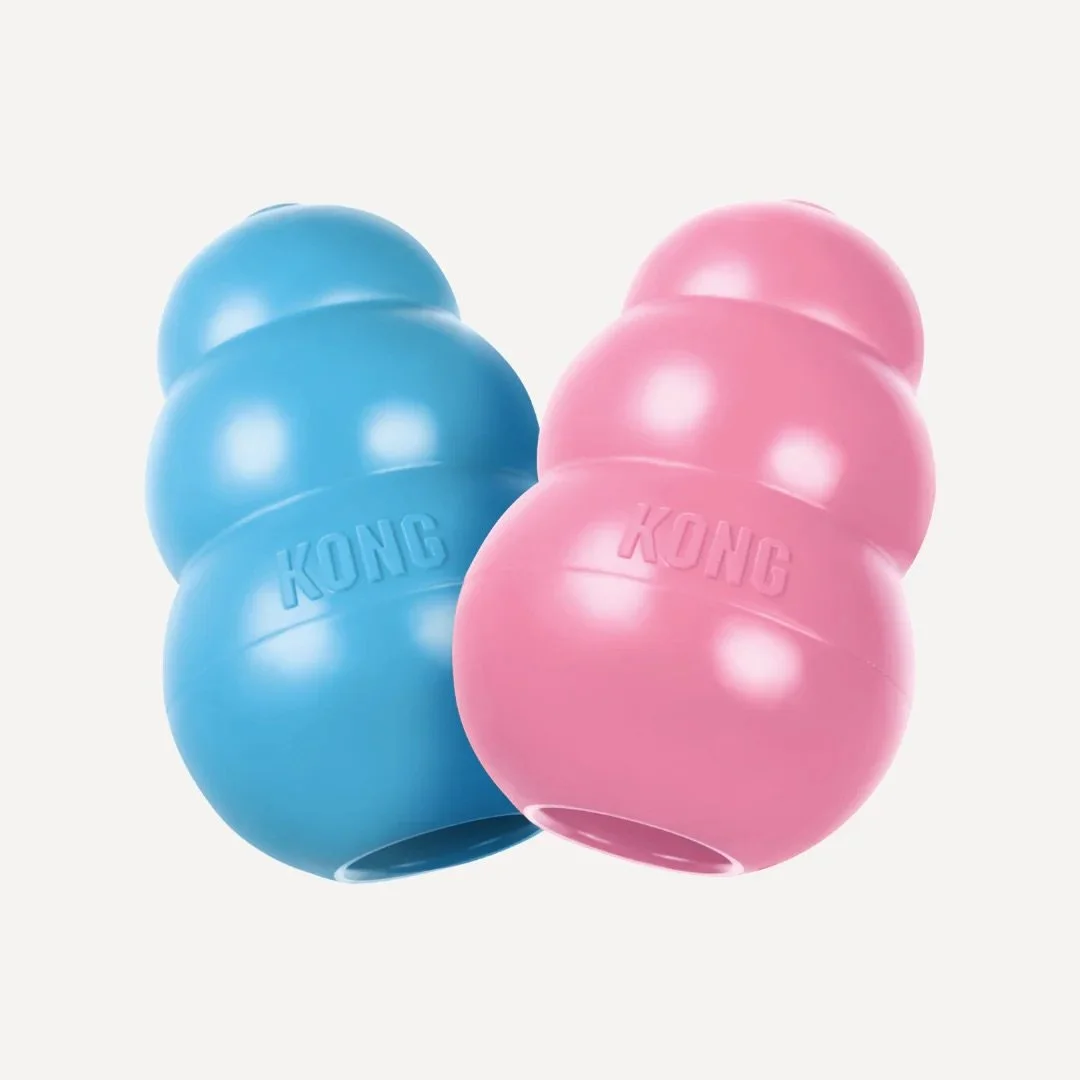 The puppy KONG is available in a large array of sizes to be perfect for whatever breed you have. It is also available in pink and blue.